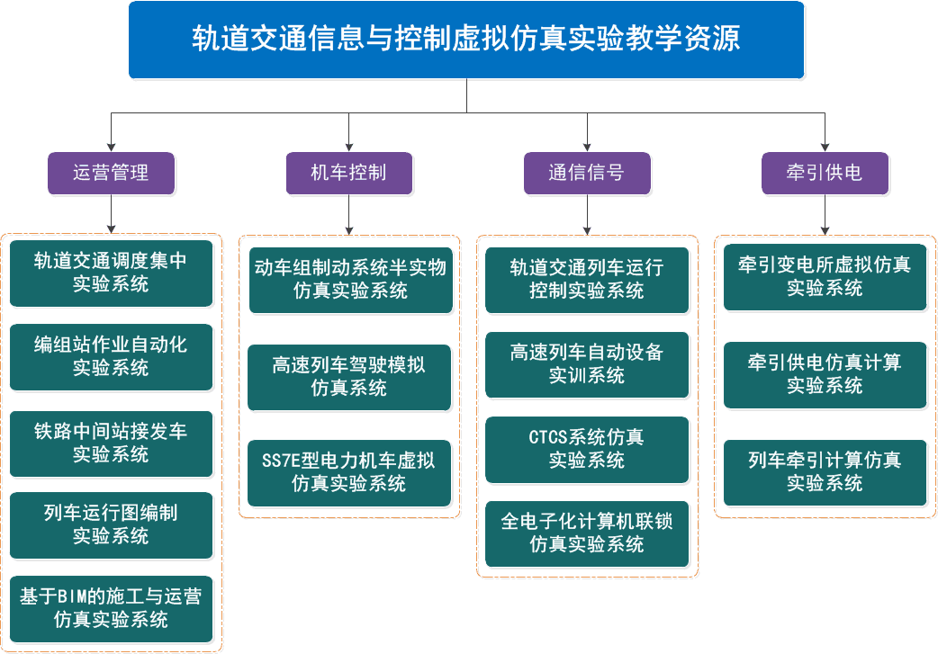 中心结合轨道交通信息与控制类专业人才培养需求,以自主研发、科研成果转化和校企合作共建为主、并引进先进的专业软件,建成了涵盖轨道交通运营管理、通信信号、牵引供电、机车控制的4个虚拟仿真实验教学资源版块,共计10余个虚拟仿真实验教学系统。